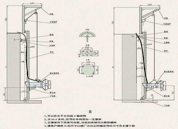 潛水?dāng)嚢铏C(jī)的潛水深度可以根據(jù)用戶需求進(jìn)行垂直上下調(diào)節(jié)。吊架座、支撐和下托架與池的連接均為膨脹螺栓固定,無需預(yù)留孔。客戶訂貨時,請?zhí)峁┏厣頗,以便我公司生產(chǎn)時確定導(dǎo)軌尺寸及支撐架的數(shù)量。