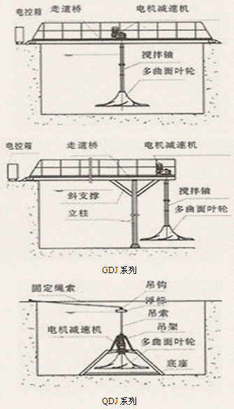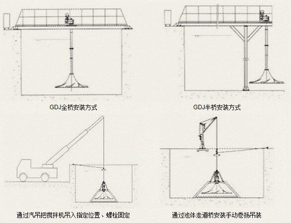 干式安裝機型根據水池深度可在主機上增加使用機架較好的提高穩定性。潛水式安裝機型在主機下安裝三腳托架用膨脹螺栓固定在池底并配有吊裝系統,葉輪一般離池底500?800mm。