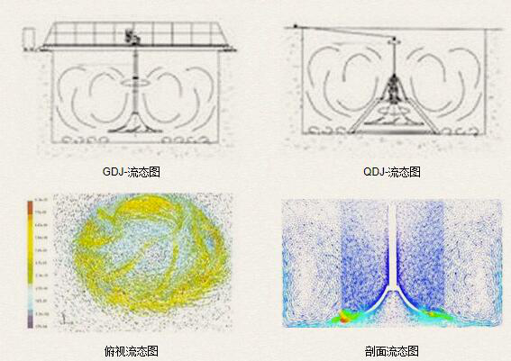 該機型的葉輪結構設計,較大限度地將流體特性與機械運動結合。雙曲面葉輪的曲面是方程為xy=b,曲線沿y軸旋轉而構成的曲面體;為了迎合水體流動,設計從葉輪中心進水,這一方面減少了進水紊流,另一方面保證了液體對葉輪表面的壓力均勻,從而保證整機在運動狀態下的平衡。在漸開多弧面上均勻布有8條導流葉片,借助液體自重壓力作補充進水獲得的勢能與葉輪旋轉時產生的離心力形成動能,液體在重力加速的條件下沿葉輪圓周方向作切線運動,在池壁的反射作用下,形成自下而上的循環水流,故可獲得在軸向(y)和徑向(x)方向的交叉水流。正是由于雙曲面攪拌機葉輪的結構特點和接近池底安裝的特點,決定了它在工作中可獲得理想的大面積循環、柔和的水流攪拌效果,能有效地消除攪拌死角。
